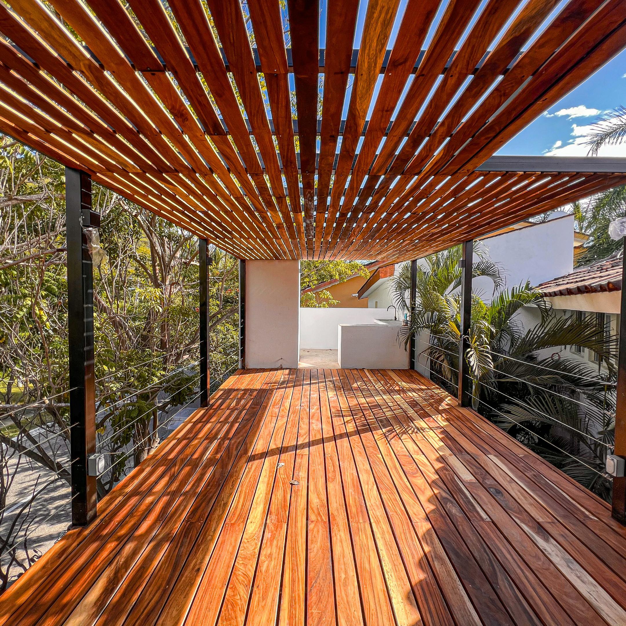 La terraza de la zona común es una gran zona para descansar y relajarse. Con su decoración de madera y su diseño simétrico, la terraza cuenta con una pequeña zona de bar, así como una piscina de inmersión/jacuzzi para relajarse.